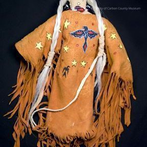 Update 2013: Label reads, "Ghost Dance Doll. This modern grandmother doll teaches about the Ghost Dance religion. The Ghost Dance spread among Plains Tribes in the 1890s. The objects painted on the dress are signs of rebirth, spirits, and nature. Native Americans wore for this type of clothing for protection".Collection