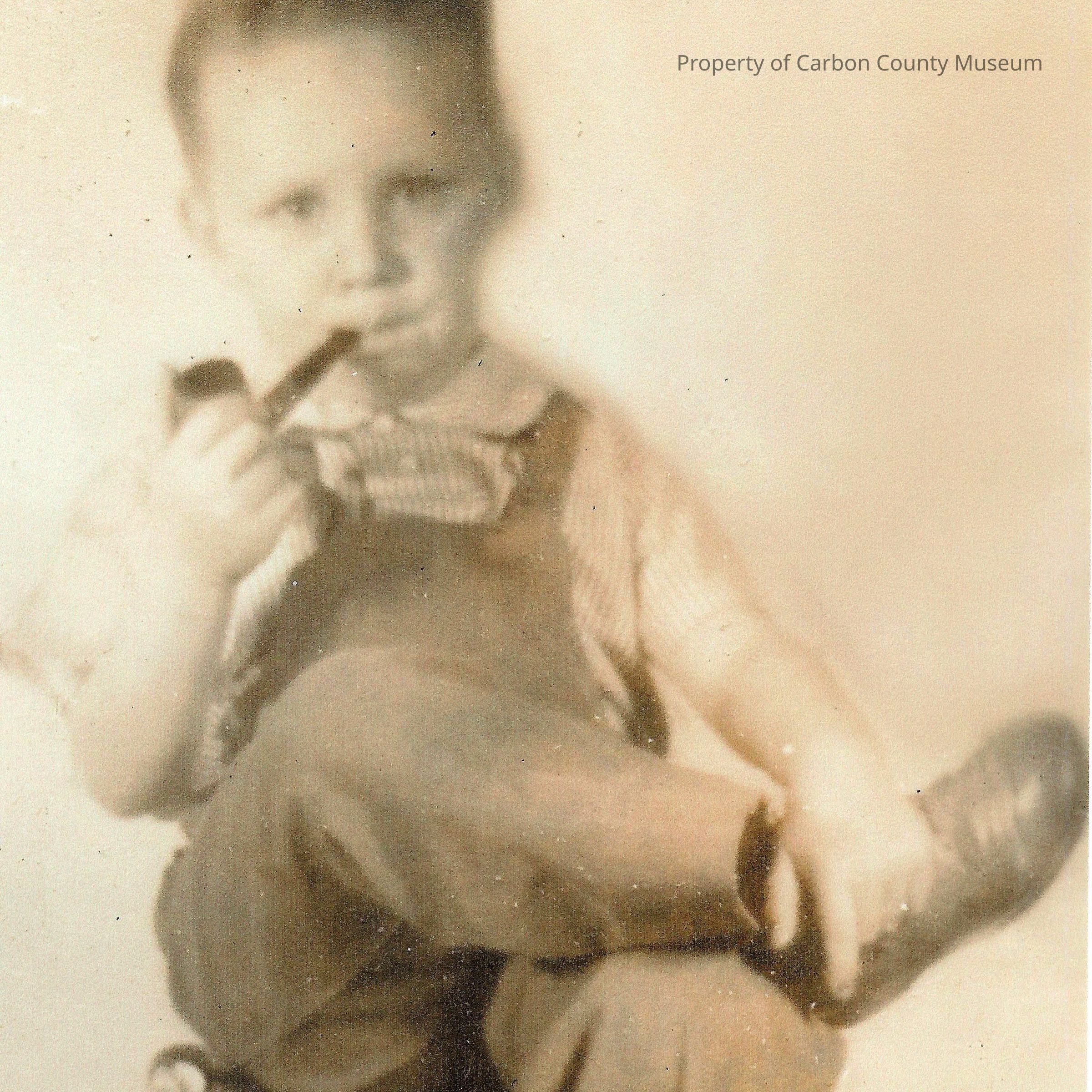 A black and white scanned photograph of Rans Baker as a young child. Image shows Rans sitting in a child's chair, wearing coveralls, short sleeved shirt, and pretending? to smoke a pipe (with an actual pipe in his right hand). Approximately 5" x 7."Collection