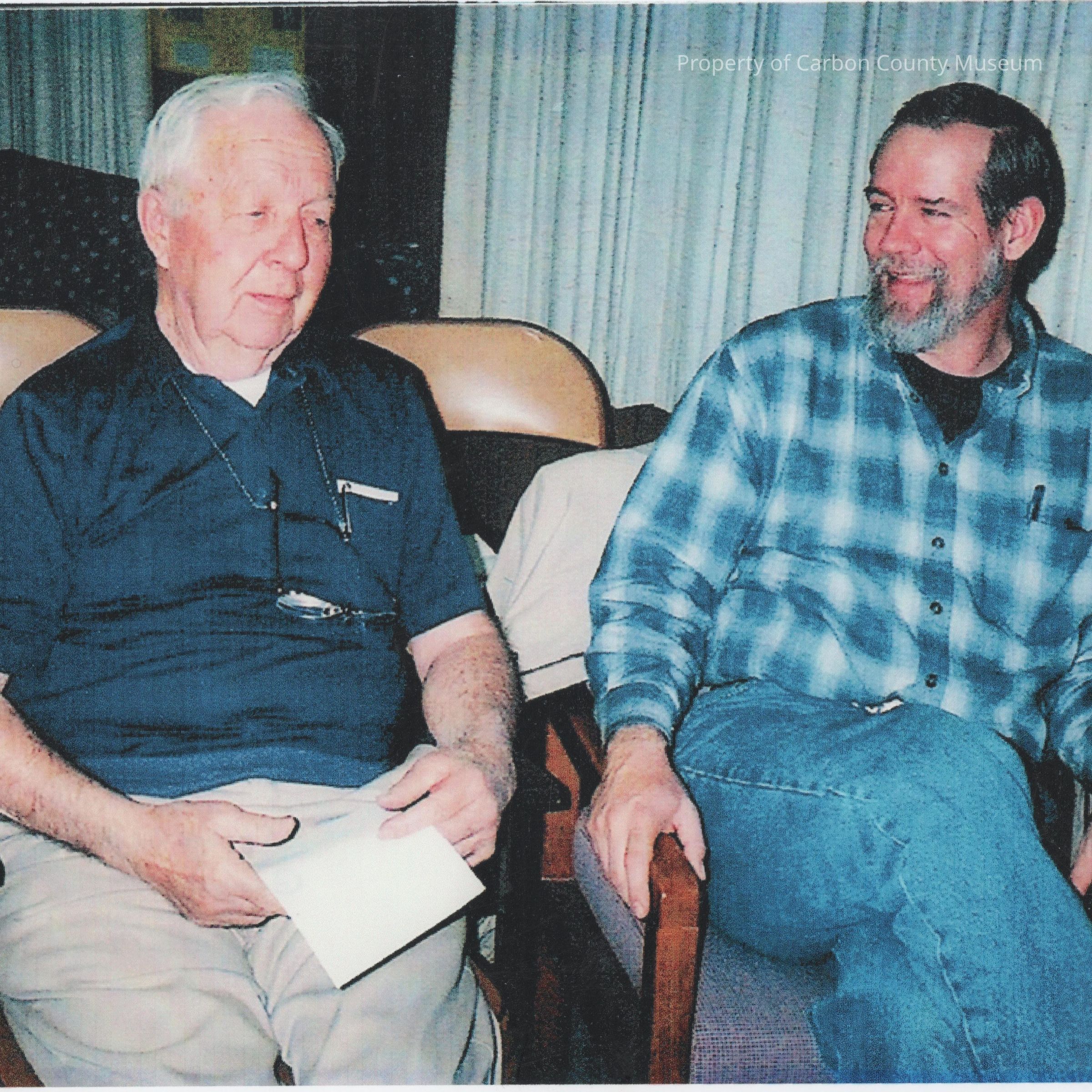 An 8 1/2" x 11" colored scanned photograph of George Brox, (photo left) and Gene Carrico, (photo right) sitting side by side in armchairs while attending Rans Baker's Anecdote Lectures on 03/28/2003. Both George and Gene have served as longtime chairmen and board members at various time periods.Collection