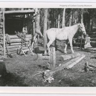 Update 2008: Black and white glossy reprint of a light colored horse with bridle and lead rope standing in a treed area with an open log structure to the left of the horse where a saddle with a rifle in a scabbard attached is laid across open wall of structures. Beneath saddle at structure and bottom edge is a small wooden pack type saddle. Foreground with small rounded long logs are lying on ground. There are several tree stumps at various location in photo. A low railing is in background to right with various objects (canvas?) draped over the log. A dead deer is hanging from a corner post of the log structure with its head facing the ground.