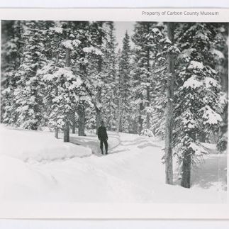 Update 2008: Black and white glossy reprint of a man dressed in dark clothing standing in a plowed area of snowy forest. He is wearing a wide brimmed hat and high top lace up boots.
