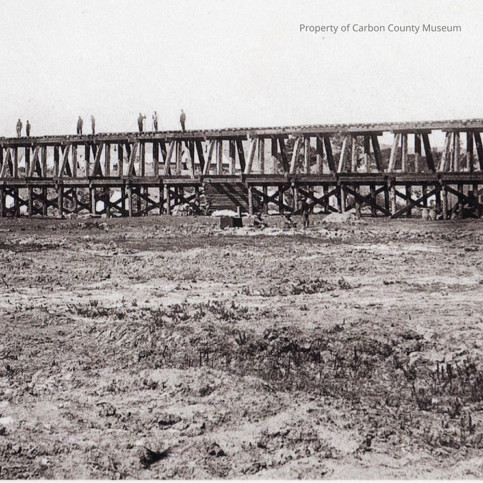 An 8 1/2" x 11 " scanned black and white print of a trestle type railroad bridge being constructed at Fort Steele, 1868. Taken by Arundel C. Hull, the donor's grandfather. Scene depicts the wide expanse of the completed bridge with some workers on top. Barren land is seen in foreground. Black print on front reads: Fort Steele Bridge, August 1868. Donor's label is on back along with his numbering of 42 18-03.Collection