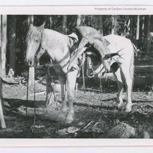 Update 2008: Black and white glossy reprint of a light colored horse with bridle reins hanging down to the ground with a dead buck deer lain sideways across saddle with its upper torso facing camera lens. Various straps and strings are hanging down from the saddle. Horse is standing on twig and leaved ground in a wooden area.