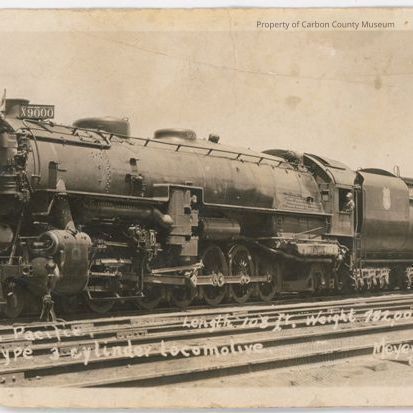 A 3 1/2' x 5 1/2" black and white photographic print postcard of 9000 type, Union Pacific Locomotive by Myers, Rawlins, WY. ca. 1927. Note on back in faded black ink.