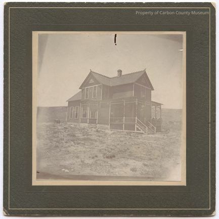 Black & white print. Snapshot. Mounted on a dark brown pattern matboard. Image of a two & a half story house sitting on a prairie with a hill in the background. House has a raised foundation & front porch with a bay window in the left wall. Lattice closes in the open area under the porch. "Dragon scale" decoration along the roof apex. Single chimney at roof line just forward of joint.
