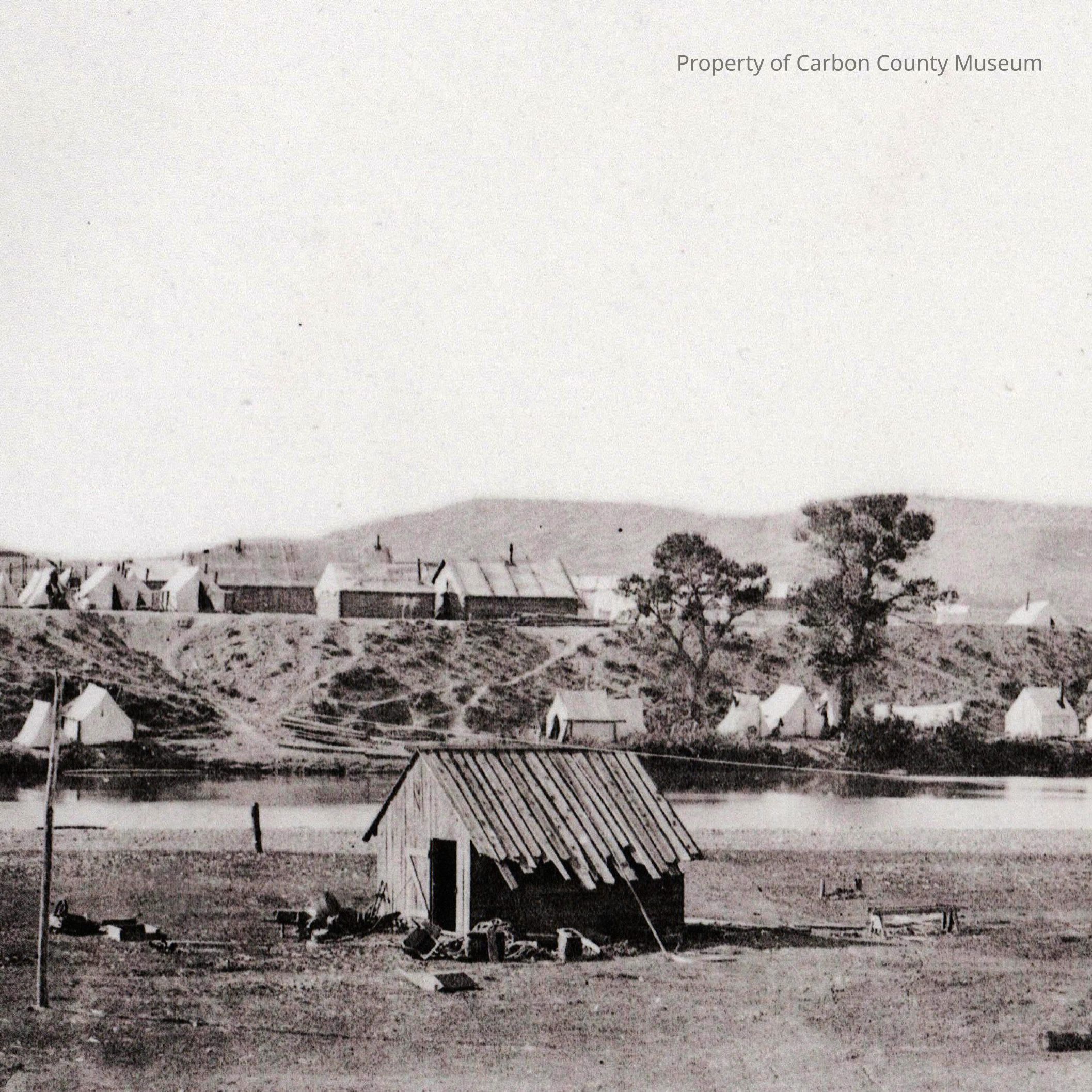 An 8 1/2" x 11 " scanned black and white print of tented structures along a river bank and above a river bank. Many tents are seen across the area on embankment as well as several wooden structures at the right. Other tents are along the river bank and there are two primitive wooden structures this side of the river. One on far right may house powder kegs?. Barren hills are in background. Foreground shows barren area with some trees along the river at side right. Black print at lower edge reads: Fort Steele on the North Platte River, August 1868. Photograph by Arundel C. Hull. Donors label on back and number 18-05.Collection