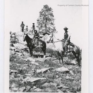 Update 2008: Black and white glossy reprint of a boulder and flat rock strewn hill with a tree standing at top center of photo. There are two men on horseback in foreground and three standing men at top of hill. Two of the men on hilltop have long rifles. Man on left has his rifle vertically at his side and is leaning on it as a cane. Man on the right has his rifle at a horizontal angle across his front lower torso. All are looking toward the photographer. The men are dressed in pants, dark and light shirts, and hats. The man on horseback in center is wearing tall boots and long gloves or wristguard on left hand and forearm.
