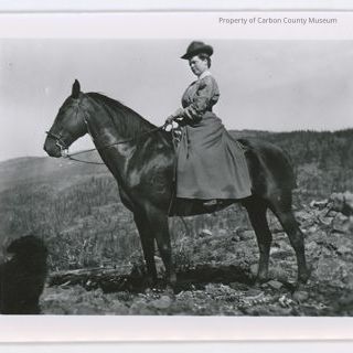 Update 2008: Black and white glossy reprint of a woman astride a shiny black horse sitting on a saddle holding both reins in her gloved left hand. She is wearing a medium colored long skirt with a patterned long sleeve blouse. Her hair is in an updo with a narrow brimmed dark hat atop her hair. The horse and rider are at the top of a high hill strewn with chunky rocks. The vista shows a tree covered area. Horse has a brand on his left foreleg shoulder of a heart lying on its side.