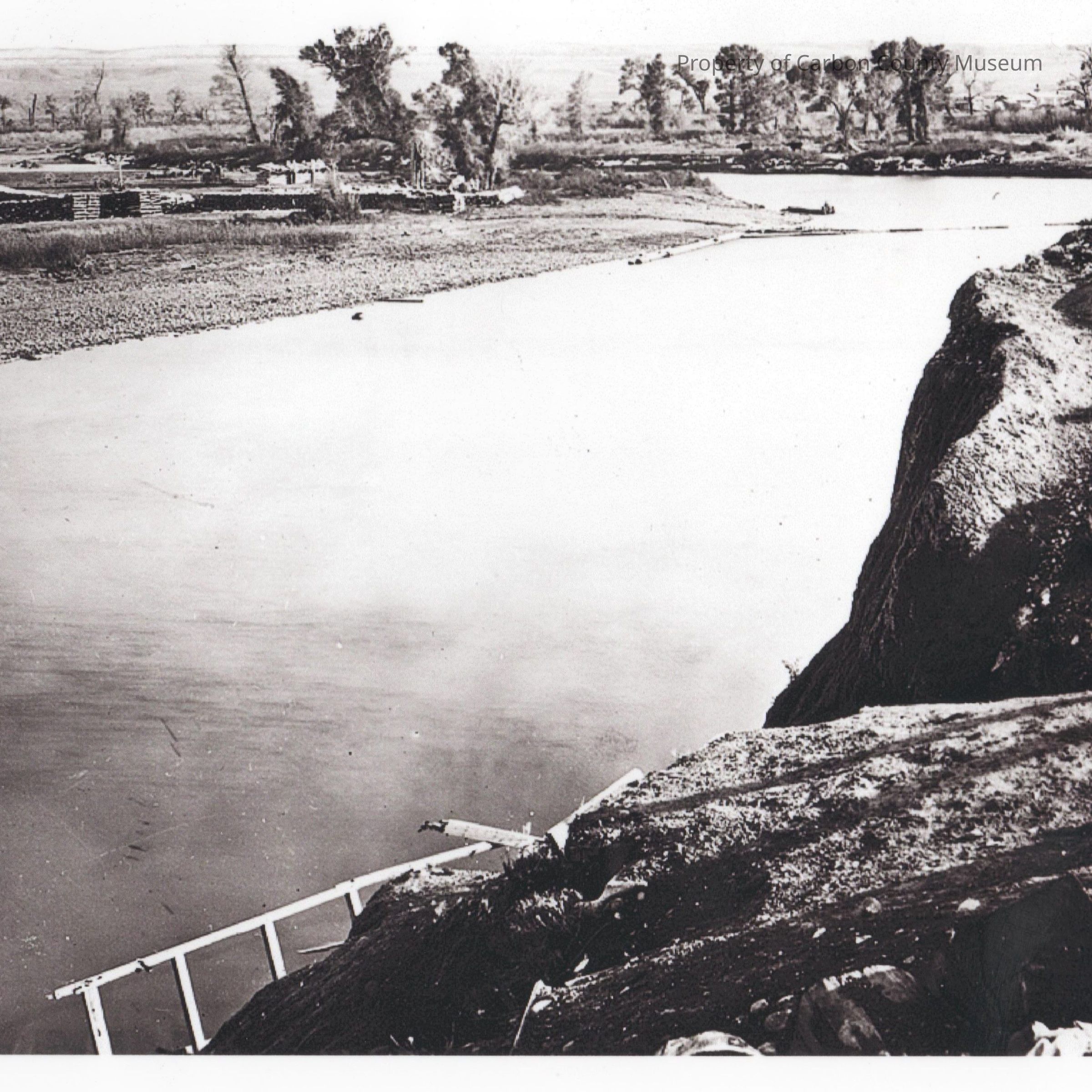 An 8 1/2" x 11 " scanned black and white print of a river with enbankment at foreground. A railing is jutting at angle at lower center. Stacks of logs? are seen at background left with distant expanse in far background. Black text at lower edge reads: Photograph by Arundel C. Hull for Jackson Bros, Courtesy USGS Brownsville Tie Camp At Fort Steele, 1869. Donor label on back with numbering 19-13 USGS swh00009.Collection