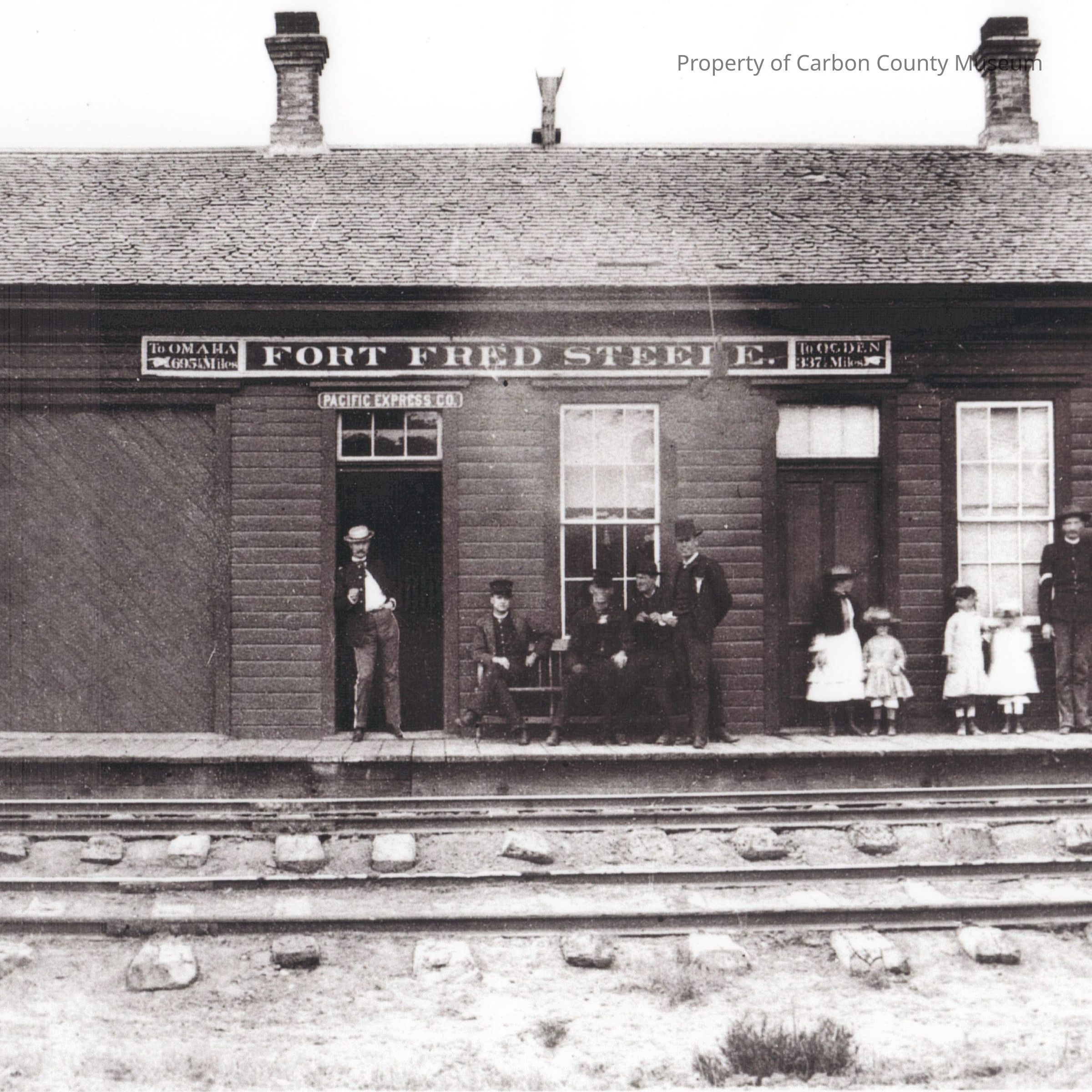 An 8 1/2" x 11 " scanned black and white print of a dark wooden building with shingled slant roof with a chimney at side left and right. Wide sign across the front of the building reads Fort Fred Steele, in smaller print at side left to Omaha _ miles and at side right to Ogden _ miles. A man is standing in the doorway with others sitting in a chair or standing in front of the building. Young girls dressed in white are at right. A solder in uniform is at the far right. Railroad tracks are at foreground.Collection