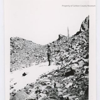 Update 2008: Black and white glossy reprint of a man standing in a remnant of snow of the side of a rocky hill with a felled timber to his left side. A lone tree stands at the horizon at the top of the hill. The man is dressed in medium colored pants, jacket and hat. His long rifle is propped against the rocks behind him at left.