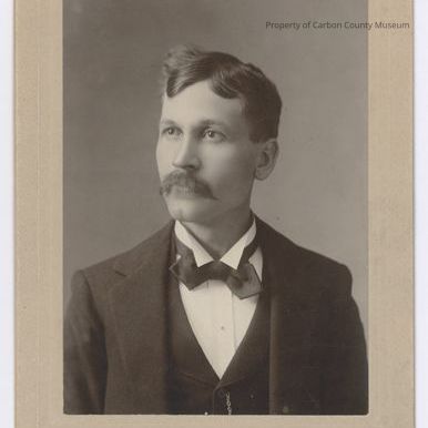 Black & white print. Studio portrait. Mounted on tan patterned matboard with indented "frame" around image. Half-length image of a young man wearing a dark 3-piece suit, white shirt & dark bow tie. He has wavy hair which is parted in the middle & sports a mustache. He is looking to the viewer's left. panted backdrop behind.