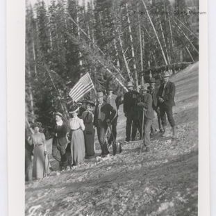 Update 2008: Black and white glossy reprint of a group of adults composed of three women and seven men standing on a snowy hillside with an American Flag showing from behind the line at center. There is a large stand of tall evergreens in background (no snow on them) with several fallen trees and others at an angle preparing to fall. The women are dressed in long skirts or dresses. The men are wearing pants, shirts, jackets. All the group are wearing hats of different styles. Several men have long walking sticks? One man has a shovel.