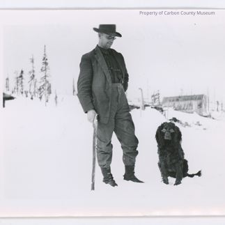 Update 2008: Black and white glossy reprint of heavy snow filled landscape with a man standing in foreground with a black dog wearing sunglasses sitting on his haunches. The man is wearing medium pants, jacket, dark shirt and hat. he has a handcane in his right hand and he is also wearing sunglasses and gazing at the dog. A few trees and buildings are in the far background.