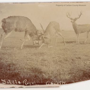 Update - January 2010: Two black & white contact prints & one post card. Image shows two antlered deer locking horns with a third antlered deer to the right looking on. Snow covered hills in far distance.