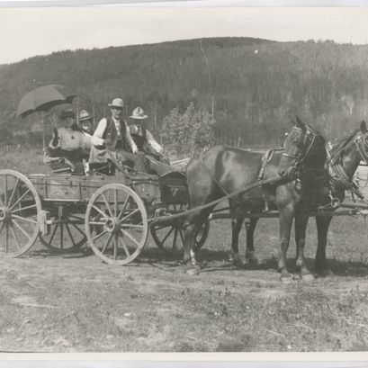 Battle Mountain Mines, 1904. Two men and ladies in a horse drawn wagon.