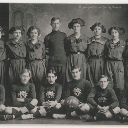 Black & white postcard image of an older girl's & boy's basketball team. the 7 girls are standing in a horizontal row wearing dark bloomer type long skorts with dark elbow length blouses with large bows at center neck edge. A single girl has a dark middy type blouse. A man wearing dark pants & dark turtleneck stands between the third & the fourth girl in the back row. the six men are seated in a horizontal row on the floor in front of the standing girls. They are dressed in dark turtleneck shirts with monogram RHS at shirt center. Unable to see color of shorts. They are wearing wide horizontal striped knee socks. Fourth boy from left is holding a basketball in his lap. Written in white on ball front is RHS 1911