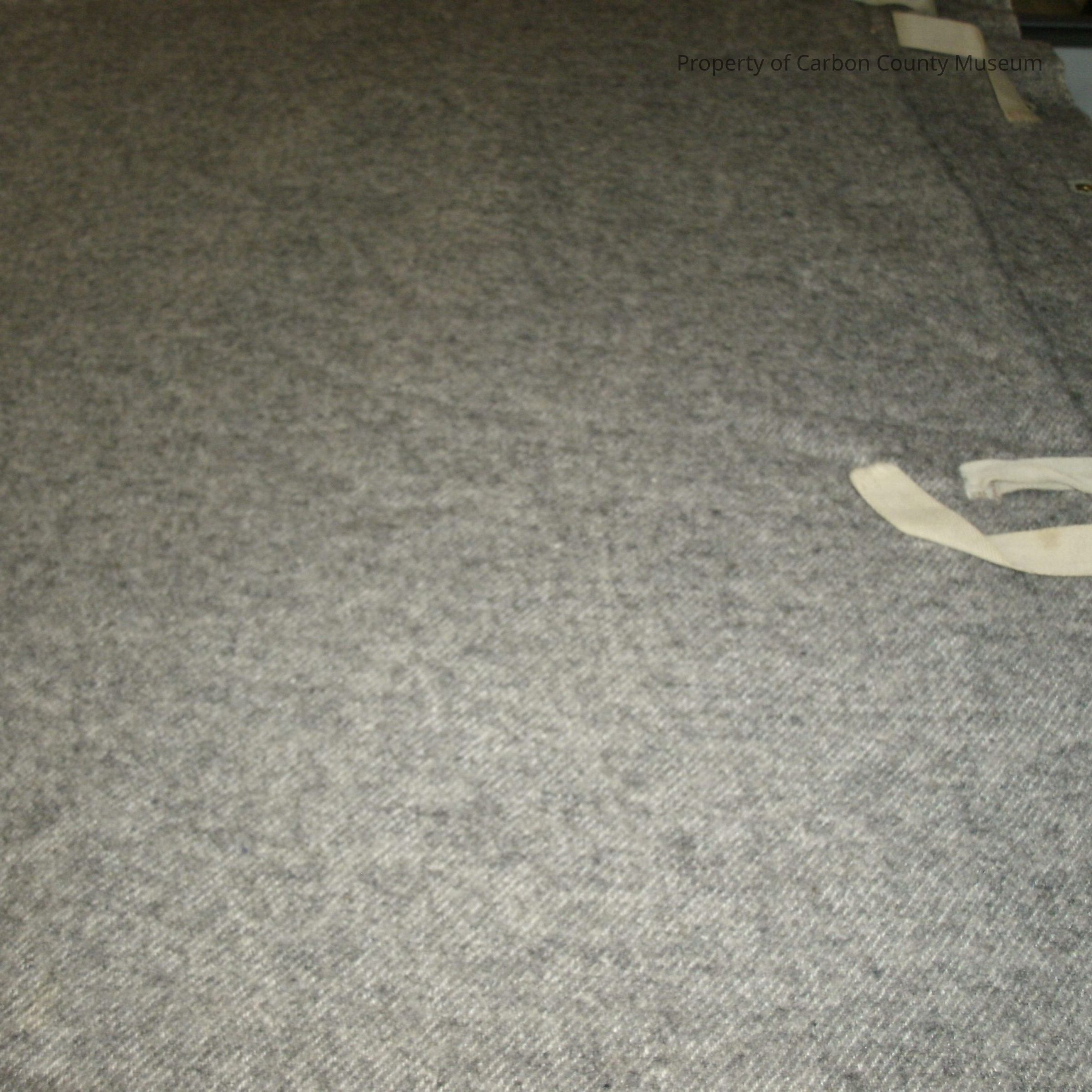 A gray woolen blanket manufactured at the Old Penitentiary. It is a double blanket held together on the sides by 19 brass colored grommets, with the top and lower edges open. A white stripe design runs horizontally across (edge to edge) on top and lower areas of blanket. There are white cloth strings attached at various areas along the side and lower edges and on the center of blanket in a vertical line. The opposite side of the blanket has a tiny white cloth trim strip with loops all attached along the entire edge and 90 degrees across lower corner. Good condition, some grommets are pulling out, some fading, discoloration on edges, slight soiling on ties, and there are two holes at the center. It is unclear what the purpose of this blanket would have been. Perhaps a bedroll liner? Measures 5'9" wide by 5'10" long, and is double thickness.Collection