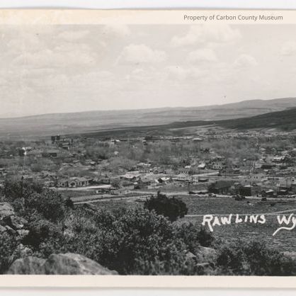 Update 1/2008: Black and white print. Image from elevation of a town laid out in a valley. Rocky scrub-covered hill in foreground; hills in background. Written in lower right on original negative: "Rawlins Wyoming."