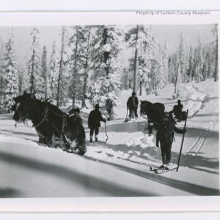 Update 2008: Black and white glossy reprint of four men and a young man in a snow-covered forest with 2 two horse teams pulling a sled, each with one man driver. The lead team seems to be stuck in the snow with the snow depth up to the horses knee joints. A man with a shovel is standing to the rear of this sled. The second horse team and sled is following in the track of the first sled. Another man with a shovel is standing to the left of the rear sled. The young man dressed in dark pants and jacket is on long skis and holding a single ski pole in his left hand. His tracks are running parallel to the sleds tracks. This photo is similar to 1948.217.0357 and 1948.217.0259.