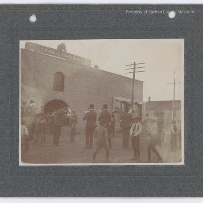 Sepia print snapshot. Mounted on grey matboard with floral design border "frame" around image & two binding holes in top edge. Image of a band facing away from photographer. Men have on dark suits and flat top hats, instruments and music stands are seen. A base drum is on photo right. Young boys are around the band. A sign on the stone building behind band reads "Coal [unreadable]" "Chas J. Johnson" "Hay Grain Feed". Telephone poles & another building in right background.