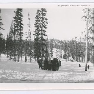 Update 2008: Black and white glossy reprint of a group of people huddled together in a close circle standing in snow covered area surrounded by tall evergreen trees with houses off in the background. There is a long man standing gin a group of trees to photos left, holding a pole. There are three figures (men?) walking toward the group from the far side.
