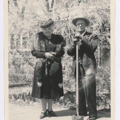 Black & white print. Snapshot. Image of a man & woman standing in front of a screen of trees & flowers. Man is dressed in a dark suit, gloves & hat & is holding the handle of a shovel. Woman is wearing a dark calf-length dress, fur stole & hat; she is holding a knitted purse.