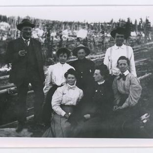 Update 2008: Black and white glossy reprint of three men and four women standing and sitting in front of a forested area in the background with many white tented structures showing through the trees and a slight hill with felled trees immediately behind them. The man standing on the left is wearing a three piece suit, tie and hat. The other two men are wearing long sleeved shirts and hats. The four women are all wearing long sleeved blouses, long skirts. Three have their hair in up do. The woman on the far right has her hair pulled to the back. Two of the women are wearing glasses. The scene behind the group of people is probably a tie camp.