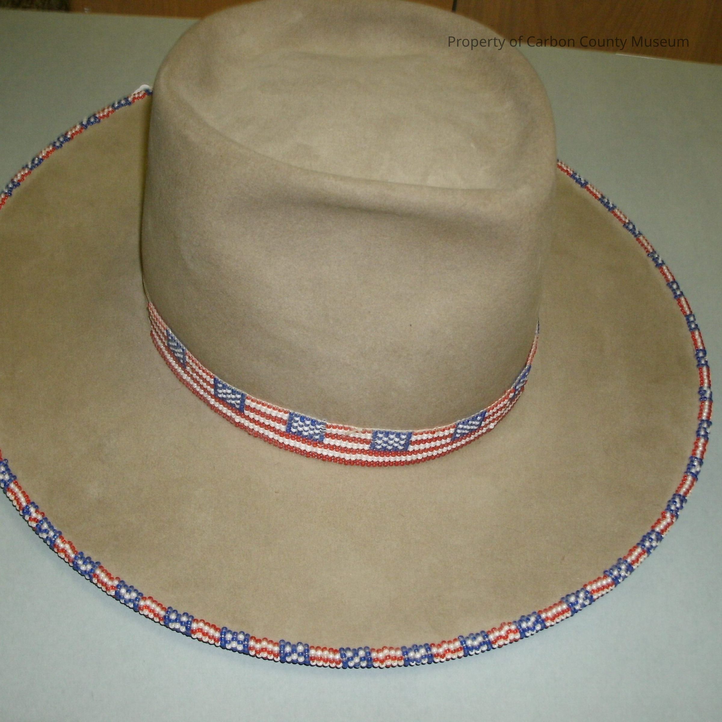 A taupe colored Stetson brand felt hat. A narrow beaded hatband encircles the crown of the hat. The beadwork design is of tiny repetitive U. S. State flags in red, white and blue beads. the hatband is tied at the hat back with white thread ends from the ends of the beadwork. A smaller red, white and blue bead flag motif encircles the entire outer edge of the brim. Donor states that the hat was a "reservation" hat, purchased from a store in Cody, WY. The hat was made in Billings, MT. ca. 1940. Hat measures 15 1/4" brim edge to brim edge (front to back) and 14 1/4" brim edge side to side. Inside crown measures 8" x 6 1/2," 5" brim width. Appraiser, W. G. Woodward, gave a value of $550. to this hat. Hat measures 15 1/4" brim edge to brim edge (front to back) and 14 1/4" brim edge side to side. Inside crown measures 8" x 6 1/2," 5" brim width. Fair condition. Hat has light stains and dark smudges on inside brim. The internal sweatband stitching is worn and loose.Collection