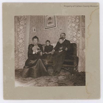 Written on back: [pencil] "Mr. & Mrs. Dave Rusk & two sons, Dave & Willard" "Page 88, pix 5, 40% 1 1/2 x 1 1/2" [black ink[ "People II-C" [light blue ink] "5".