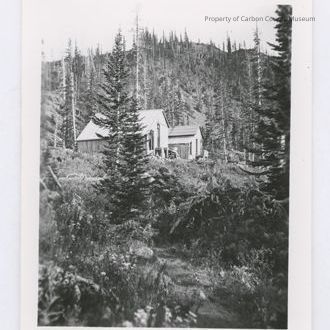 Update 2008: Black and white glossy reprint of two wooden houses side by side surrounded by tall evergreens with a small mountain rising in the background. A small ravine with flowers, rocks and pathway are in forefront of photo. Both houses have high porches.
