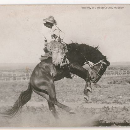 Update 2012: Black and white card Image of a bucking bronc and a cowboy riding him. the horses front feet are off the ground with his head down, back arched and tail flying. Dust is beneath his back legs. The cowboy wears a hat, white shirt, neck scarf and Angora chaps. He is forward in the saddle and both hands are near the saddle horn.