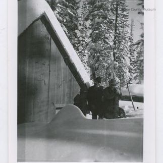 Update 2008: Black and white glossy reprint of deep snow in the foreground with a snow covered house and tall trees to photo left edge and center area. Two men are standing next to corner of house dressed in dark pants, jackets and hats. The man on photo left is smoking and man on photo right has both his arms propped on a post of some type. A dog's hindquarters are showing from behind the man on right.
