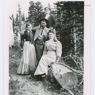 Update 2008: Black and white glossy reprint of a man and four women with a forest background. The man is in the center of photo standing with his right arm around an older woman who is wearing a long light colored skirt with a ruffle insert on the bottom edge and a dark colored blouse with a white collar and long front tie with a pin at the top. The man has his right arm around a woman who is seated on a felled tree. Another woman is standing on the log behind the man and seated woman resting her hands on the man's shoulders. all the women have their hair in updo's. The man is wearing dark colored pants, light colored shirt with tie inserted into the shirt, and a light colored jacket and dark hat. he may have his left leg propped on the tree trunk as his torso is bent to the left.