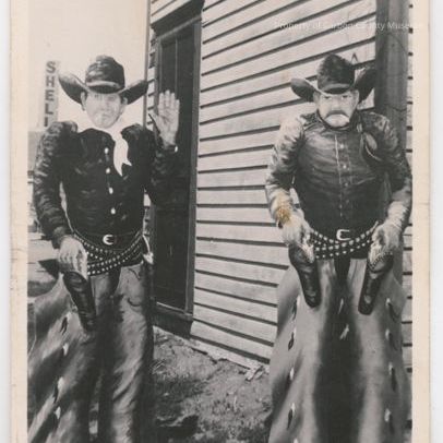 Black and white card. 2 Flat, wood cowboy props, in full western attire, with faces cut out. 2 men pose behind with their faces looking through the openings.