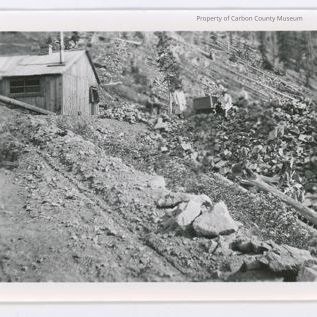 Update 2008: Black and white glossy reprint of a rocky slag heap in foreground extending up a hill to center of photo where two men in slicker type coats are on either side of an ore cart . Man on left is standing, man on right is seated. there are two women at the same location and one is standing looking into ore cart, possibly holding a chunk of rock. The other lady is seated on the rock pile with her hands in her lap. Felled timbers (trees) lie scattered throughout hillside. On center left edge of photo is a partial view of a wooden building with double hung windows on front side and an open door on building end. A brick chimney and pipe chimney are rising from two different locations on rooftop. Section of print where men and women are located is blurry.