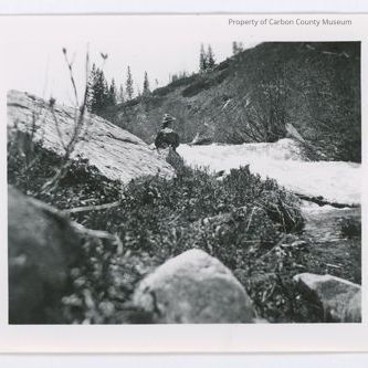 Update 2008: Black and white glossy reprint of a woman sitting on the right side of a rocky outcropping by a fast moving creek showing white water rapids at top and clear water at bottom edge. A hill rises in the background with sparse vegetation and few trees on the horizon. The foreground consist of large boulders and brush. The woman is wearing a dark puffy sleeved blouse with white scarf? and a wide brimmed medium crowned hat with two creases in hat visible.