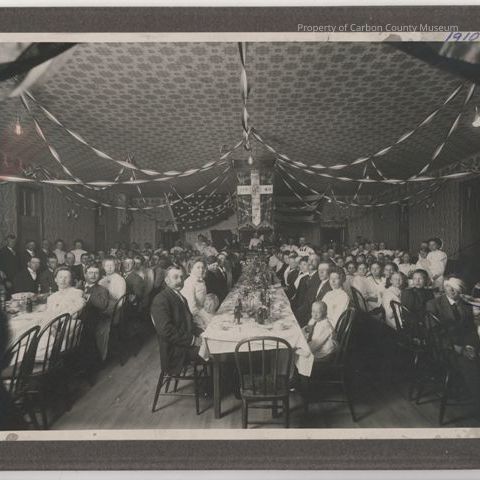 Black & white print attached to dark grey matboard which has been irregularly cut down. Image shows the interior of Rawlins Danish Hall, which was located at 212 2nd Street (now the lower parking lot for the Bank of Commerce). This print was found in Larsen Photo Album #31, the number of the print is 1957.284.0133 and located in the Photograph Collection. There are three very long banquet tables, covered with white linens, floral centerpieces & dinnerware. Men, women & children are seated at these tables & are turned in their wooden chairs to look at the camera. The ceiling area is highly decorated with streamer ribbons cascading from ceiling to each side of the room over the tables. The ceiling of the room has a decorative wallpaper? covering & the walls have a different patterned wall covering. Other men & women are seen in the background side left & at the far end of room. A large banner is suspended from the ceiling center over the middle table. A white cross is appliqued to a darker fabric. Printed in two curved lines across banner: Rawlins Lodge of the Danish Brotherhood of America.