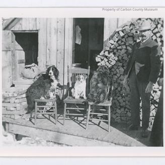 Update 2008: Black and white glossy reprint of three dogs of different pedigrees each sitting in a chair lined horizontally across a wooden porch of a wooden planked house . To the right side of the dogs is a man wearing a three piece suit, laced footwear, a hat and holding a pair of gloves in his right hand. Behind and to the side of the mustached man is a tall stack of cut wood rising against the outside wall of the house to above the man's height. An open door is center point of background with another smaller open door on photo left as if a storage area with a wrapped object showing inside. More cut stacks of wood are under his door and frame.