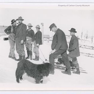 Update 2008: Black and white glossy reprint of three men holding/pulling ropes to a double runner sled loaded with a covered bundle tied on with ropes. A fourth man is facing camera wearing dark boots, medium toned pants, vest, jacket and dark shirt with white buttons, medium hand and smoking a pipe. A man pulling the rope is wearing a dark hat with goggles at the crown. The fifth and sixth man are to the left rear of the sled. Both are dressed in boots, pants, jackets and hats. A black curly-haired dog is standing in foreground watching the men and sled. The landscape is snowy with several buildings in background far left and center.