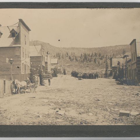Black & white print attached to dark grey matboard. Image shows an early day main street scene with log, wooden & brick buildings on either side of the rough flat rock strewn road bed. At the far end of the street a large group of men are gathered in a semi-circle with their backs to camera. One man on horseback is seen near the crowd. A large boulder is in the road near the horse. A semi-deforested hill is seen in far background. A two horse (one white, one black) team wagon is at foreground left. A man is seen walking away from it toward the crowd.