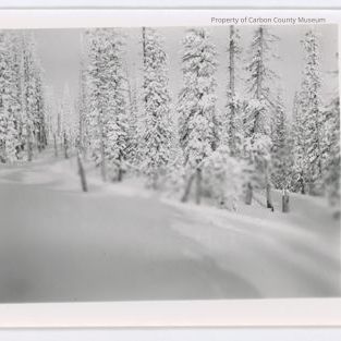 Update 2008: Black and white glossy reprint of heavily snow covered tall trees and ground. Photo has blurry area at center foreground.