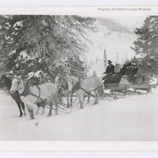 Update 2008: Black and white glossy reprint, of a four horse team, (three white and one dark) pulling a buckboard type sled with four women and a man in deep snow with snowy mountain and trees in the background. The man is sitting in the front seat holding on to the reins and has his left leg crossed over his right. The three women are dressed in heavy winter clothing. The woman sitting by man in front seat is wearing a one pieced hooded wrap that covers bodice front. Three women seated on back seat are wearing hats and furs draped around their necks. They appear to have a lap robe. Behind this last seat are a trunk and packages tied to sled with ropes.