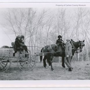 Update 2008: Black and white glossy reprint of a two horse team pulling an open wooden wagon with a large trunk in back behind the front seat. A driver (on near side) and a passenger are seated on a bench type seat. The occupants are blurry, not able to determine details. They are wearing dark colored clothing. Person on the near side is wearing a hat while the person on the far side is wearing a had wrap/hat. Sitting sideways the horse of the team is a toddler-age child wearing shoes, dark pants, jacket and cloth hat. A tall man is standing next to horse and child smiling into camera. He has his right hand holding the child on the horse. His right leg is crossed over his left leg at ankle. Tall aspen trees are in the background and short vegetation is in foreground.