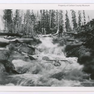 Update 2008: Black and white glossy reprint of a waterfall in the forest with felled trees lying across the headwaters and tall evergreens in the background. A man dressed in black clothing is standing at top right of headwaters. There is a blurred section in photo at center and bottom from movement of water.