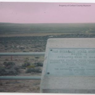 Color photograph and replica color slide (John McCormick photographs). Photographed is a landscape, metal railing and a cement stand with a plaque that reads "The Overland Stage Station Route, operated 1863-1868, Washakee Station Four Miles East, Barrel Springs Station Fourteen Miles West (hard to read bottom)." When looking for the exact location of this sign I found in information in the book Historic Sites and markers along the mormon and other great western trails by Stanley Bucholz Kimball, pg 196. It states, "20 miles south of Creston Junction with I-80, on Baggs Road County, in sec. 9 T17N, R92W. The Creston Junction is about 25 miles west of Rawlins on I-80; exit, then go south on Baggs Road about 20 miles. The fenced marker is west of the road. From here good trail ruts are visible both to the east and to the west." "Overland Stage Station Route/ Washakee Station 4 miles East/ Barrel Springs Station 14 miles west/ Historic Landmark Commission/ 1951." The back of the color slide reads, "overland stage line marker between Hwy #302 Baggs" and "10" and "SEP 76" stamped on back.Collection