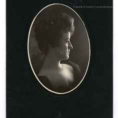 Black and white print. Studio portrait. Oval mounted on black matboard with raised oval frame around image. Profile head and shoulders portrait of a woman in a low cut dark dress. Her hair is pinned up.