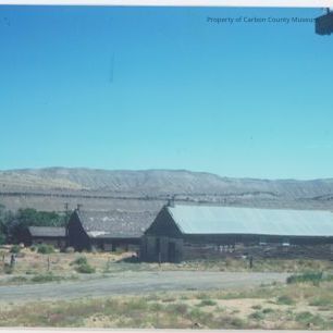 Color photograph and replica color slide (John McCormick photographs) of three long buildings, landscape and a fence. The front of the slide says, "Ft. Steele, Wyo". The back has "7" and "SEP 76" stamped on back. *Carol says they are the buildings at Ft. Steele before they burned down.Collection