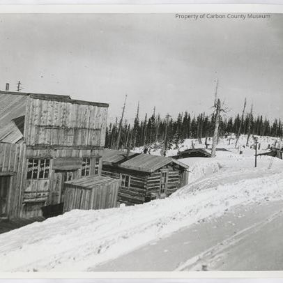 Update 2008: Black and white glossy reprint of a winter scene in Battle, Wyoming of The Office Saloon and small shed in foreground and a log cabin to right of saloon and other structures in the background and right edge of photograph. Deep snow is in foreground, but cleared from saloon sidewalk and around log cabin. The saloon an cabin are free of snow, where the next closest structure has snow at back of house to rooftop and covering the back section of roof. The saloon is of wood plank construction with single door on the left side and a double door in the center of building. There are two windows together on each side of the double door, with white lettered sign "The Office Saloon" painted across the upper panes of both sections of windows. Some trees on the right side of photo have been cut down and tree stumps are sticking up throughout area. Tall trees are in the far background.