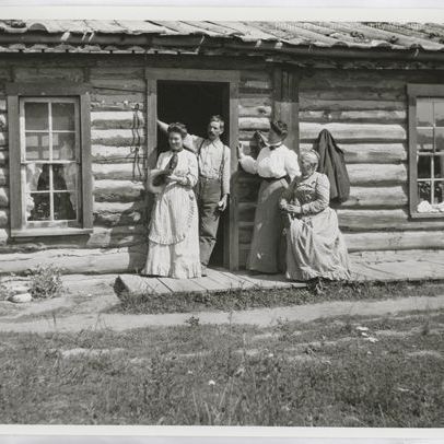 Update 5/2010: Black and white glossy print. Image shows a log cabin with tall paned window on each side of the open doorway. Roof is composed of split logs. Wood planked sidewalk in front of building. A man is standing in doorway with a woman dressed in vintage clothing, apron, and holding a hat is standing close to him. Two other women are at right, both wearing long dresses, skirts and long sleeved tops. One of these women is standing and the other is seated in a chair. A coat jacket hangs on the outside wall of structure at right. Sparse vegetation at foreground.